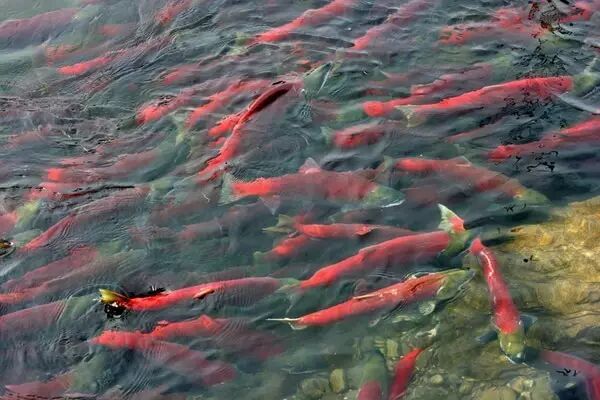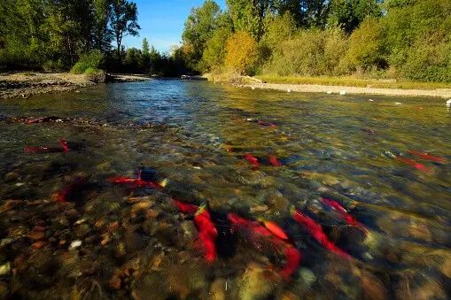 不知不觉间,就又到赏枫叶,观三文鱼洄游的季节了。超过五亿条北美太平洋鲑鱼离开北美太平洋,展开五千公里的返乡旅程,回到出生地的淡水河流中产卵。它们将目的地的河流湖泊染成一片猩红,非常壮观。