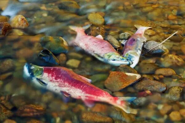 九月底、或十月初,所有成熟的三文鱼从海上逆流而上,沿着它们出海的路线逆向前进。返回的路上消耗掉它们身体里几乎所有的能量和体力。有些三文鱼变成了其他动物的美食,有些三文鱼则在快到达目的地前力竭而亡,极少数活下来的三文鱼才能到达产卵地。产卵地一般都是水面开阔,水流平缓,水深浅平,阳光充沛的池塘或峡谷。