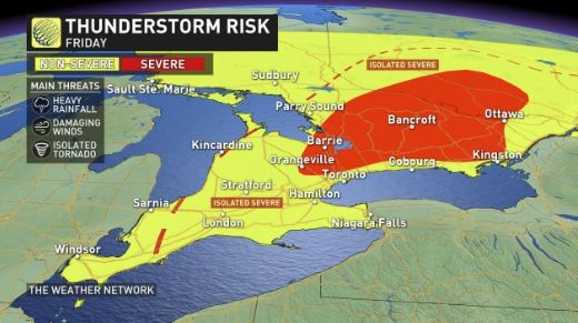 此外,据Weather Network的天气预报说道,安省中部和东部受本次极端天气影响最大,从GTA北部到Cottage Country,再到Ottawa Valley,都有刮龙卷风的可能性,请当地居民留意气象部门的预报及警告。